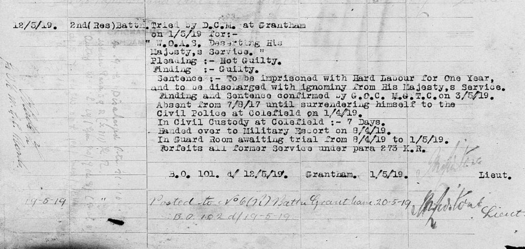 He deserted again on 7 August 1917 until he gave himself up in Coleford on 1 April 1919. He was handed over to a military escort on 8 April 1919 and held in a guard room until 1 May 1919. He faced a court-martial on 1 May 1919 and was tried for “deserting his majesty’s service”. He pleaded not guilty but was found guilty as charged and sentenced: